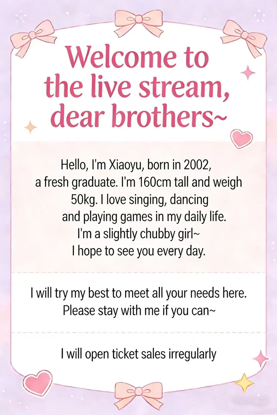 Hello, I'm Xiaoyu, born in 2002, a recent college graduate. I'm 160cm tall and weigh 100kg. I enjoy singing, dancing, and playing games. I'm a slightly chubby girl~ I hope to see you all every day!